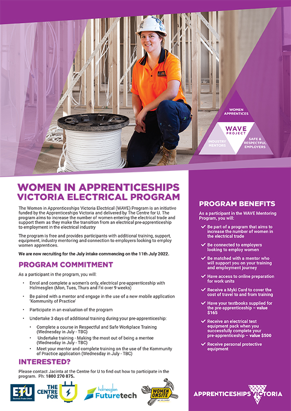 The Women in Apprenticeships Victoria Electrical (WAVE) Program is an initiative funded by Apprenticeships Victoria, and delivered by The Centre for U.