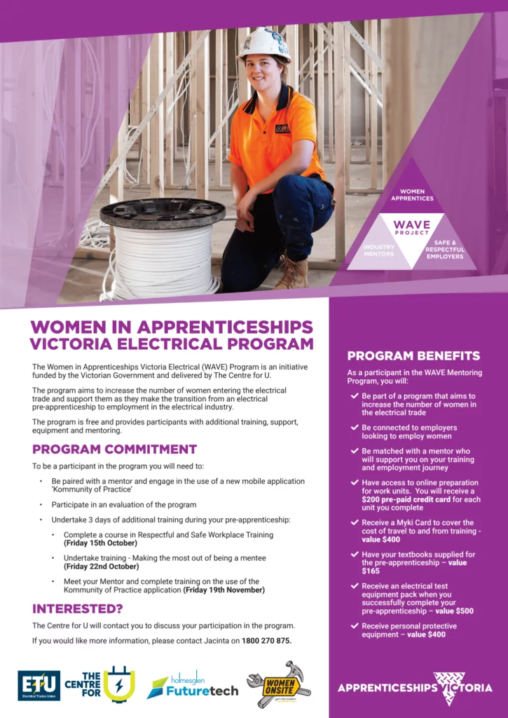 The Women in Apprenticeships Victoria Electrical (WAVE) Project is an initiative funded by Apprenticeships Victoria, and delivered by The Centre for U.